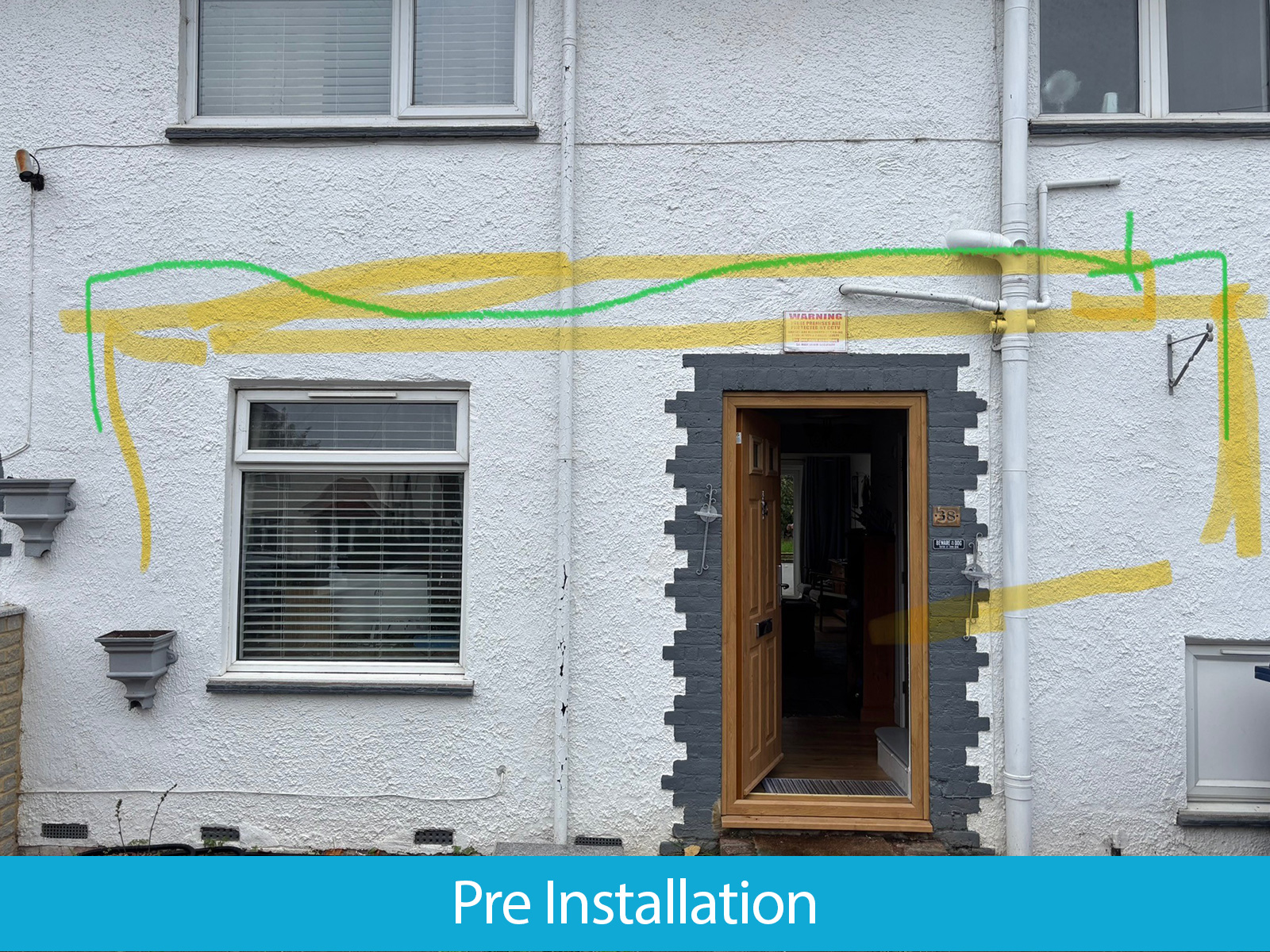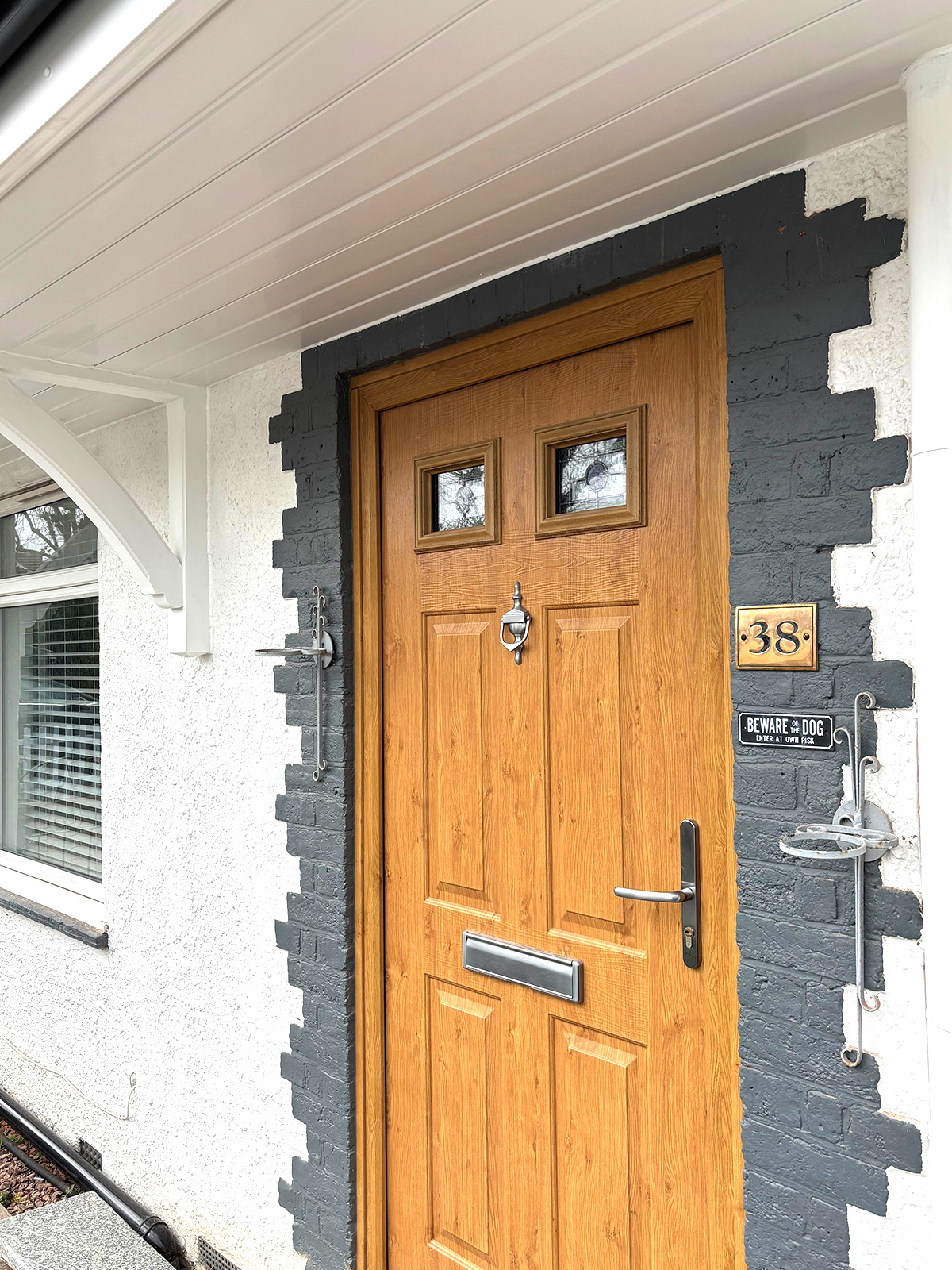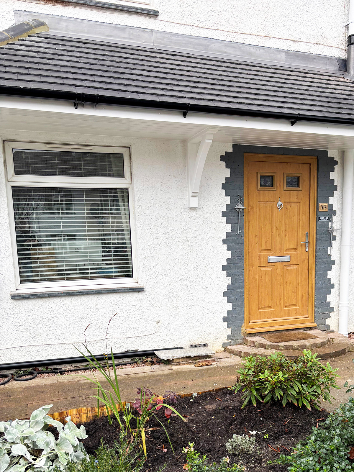Finally, to complete the camouflaging effect, the smaller downpipe to the left of the front door was removed and reinstated further left at the end of the property and painted black. The larger soil pipe and connecting pipes on the right could not be moved, but by enclosing it inside the new canopy and matching the colours, we did our best to conceal it as far as possible.