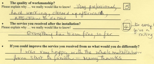Prior to the installation we were given a clear explanation of the process, a breakdown of costs and NO tedious sales pitch!